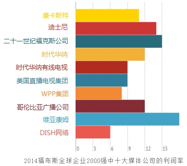 今年,在福布斯全球企業(yè)2000強(qiáng)的十大媒體公司中,美國(guó)擁有九家公司。媒體巨頭維亞康姆(Viacom)盡管在全球企業(yè)2000強(qiáng)榜單中只是第九大媒體公司,但由于電視收視率攀升而取得了18%的利潤(rùn)率。二十一世紀(jì)??怂构荆═wenty-First Century Fox)以15%的利潤(rùn)率在十大媒體公司中排名第二,這要?dú)w功于其從前出版機(jī)構(gòu)新聞集團(tuán)(News Corp)分拆出來(lái)。