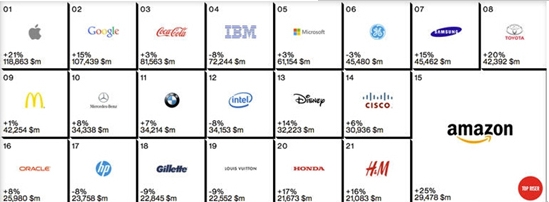 六家科技類公司位列前十,IBM位于第4,微軟和三星緊隨其后。亞馬遜(Amazon) 和Facebook分別位列15和29。Interbrand指出二者都有巨大的上升空間。