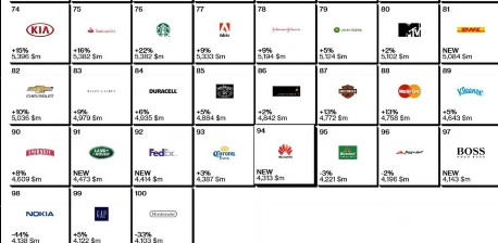 前100名中首次出現(xiàn)了中國品牌——華為。公司位列94名。華為的安卓智能手機(jī)以低廉的價格為消費(fèi)者所熟知。Interbrand稱,華為正設(shè)法擺脫價格低廉的形象,逐步在公眾眼中構(gòu)建高檔品牌的新形象。
