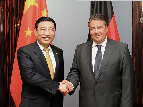 10月10日,第三輪中德政府磋商期間,工業(yè)和信息化部部長苗圩與德國聯(lián)邦副總理兼聯(lián)邦經(jīng)濟(jì)和能源部部長西格瑪爾·加布里爾舉行會(huì)晤,雙方就中德電動(dòng) 汽車合作、中國擔(dān)任2015年德國漢諾威消費(fèi)電子、信息及通信博覽會(huì)(CeBIT)合作伙伴國以及中德工業(yè)創(chuàng)新合作等議題交換意見。雙方對(duì)兩國在電動(dòng)汽 車、中小企業(yè)、應(yīng)急產(chǎn)業(yè)等領(lǐng)域的合作表示滿意,并商定于2015年在中國共同舉辦中德中小企業(yè)論壇、新能源汽車產(chǎn)品市民體驗(yàn)活動(dòng)、新能源汽車創(chuàng)新合作論壇和應(yīng)急產(chǎn)業(yè)論壇。